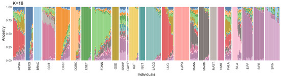 Admixture analysis for the best-fitting model. Each bar represents the genetic composition of a subject, according to the Q-value of the 18 clusters (K) included. Breeds included: Fonni’s dog (FONN), Pastore Apuano (APUA), Bergamasco Shepherd (BERG), Bracco Italiano (BRAC), Cane Corso Italiano (CCIT), Cirneco dell’Etna (CIRN), Pastore D’Oropa (DORO), English Setter (ESET), German Shepherd dog (GSD), German Shorthaired Pointer (GSHP), German Wirehaired Pointer (GWHP), Italian Greyhound (IGIT), Irish Setter (ISET), Lagotto Romagnolo (LAGO), Lupino del Gigante (LUGI), Lupo Italiano (LUPO), Mannara dog (MANN), Maremma and the Abruzzi Sheepdog (MARM), Mastiffs (MAST), Neapolitan Mastiff (NMIT), Pastore della Lessinia e del Lagorai (PALA), Pastore della Sila (SILA), Segugio Italiano a Pelo Forte (SIPF), Segugio Italiano a Pelo Raso (SIPR), and Spinone Italiano (SPIN).