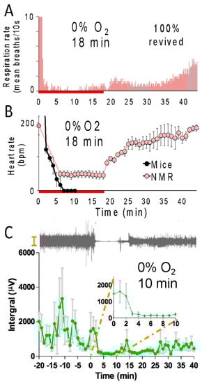 Naked mole-rats show reduced physiological activity during anoxia. Average respiration rate (A) and heart rate (B) of naked mole-rats during an 18 min anoxia exposure (red line below the X-axis) followed by normoxia. These data are from [19]. (C) Top, an example electroencephalography (EEG) trace from a naked mole-rat before, during, and after a 10 min of exposure to anoxia. Bottom: average brain activity for naked mole-rats before, during, and after a 10 min exposure to anoxia. This data is from [25]. N = 3 for panels (A–C).