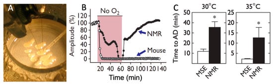 Additional studies using electrophysiological assessments of hippocampal brain slices in an interface recording chamber reported intrinsic brain tolerance to anoxia in naked mole-rats [27,28], see Figure 3A. Evoked potential data for one slice from a mouse and one slice from a naked mole-rat are illustrated in Figure 3B, wherein the slices were stimulated alternately every 10 s. After reaching a stable baseline, the slices were exposed to anoxia until both slices lost function (shaded area). In these examples, the slice from a naked mole-rat took significantly longer to experience anoxic depolarization (AD) and loss of detectable functionality. After reoxygenation, naked mole-rat slices showed recovery of synaptic transmission, while mouse slices did not. Given that naked mole-rats and mice have disparate body temperatures (32 °C and 37 °C, respectively), studies were undertaken at waterbath temperatures approximating their divergent body temperatures (Figure 3C). While waterbath temperature greatly affects the time to loss of synaptic function and transmission, it should be noted that at both temperatures, the naked mole-rats showed a significantly longer time to loss of detectable functionality.