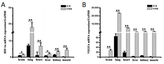 Quantified levels of HIF-1a mRNA in naked mole-rats compared to ICR mice are shown in (A), where a significant increase in expression was seen in all six measured tissues. Significant increases were also seen in VEGFA mRNA expression in the naked mole-rat across the same tissues as shown in (B). * p < 0.05, ** p < 0.01. These data are from [36].