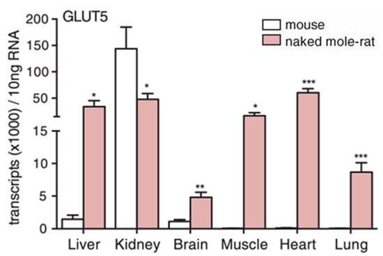 Naked mole-rats have significantly higher levels of the fructose transporter, Glut5, in most organs compared to mice. * p < 0.05, ** p < 0.01, *** p < 0.001. This data is from [19].