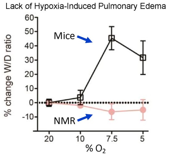 Another detrimental effect of hypoxia in most mammals is a rapid buildup of fluid in the lungs known as pulmonary edema. This is caused by altered sympathetic tone, vasoconstriction, and pulmonary hypertension, as well as altered alveolar endothelial and epithelial permeability to water and macromolecules, causing an increased permeability across the alveolar barrier and the capillaries to leak into the alveolar sacs and interstitial spaces that overwhelm the alveolar reabsorption capacity [44]. This is manifested by a change in the wet/dry weight of excised lung tissue. Naked mole-rats appear to be completely immune to this effect. Park et al. [19] exposed naked mole-rats and mice to normoxia (20% O2) or hypoxia (10%, 7.5%, or 5% O2) for 15 min. Mice showed severe pulmonary edema for hypoxic atmospheres of 7.5% and 5% O2, while naked mole-rats showed no edema at either of these low O2 concentrations. (Figure 7). Currently, the mechanisms facilitating the lack of hypoxia-induced edema in naked mole-rats are unknown.