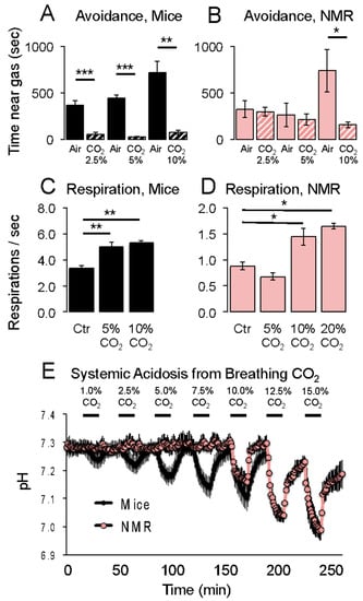 Responses of naked mole-rats and mice to elevated CO2 concentrations. Aversion behaviors are shown in (A,B). Respiration rates are shown in (C,D). Systemic acidosis is shown in (E). * p < 0.05, ** p < 0.01, *** p < 0.001. These graphs are from [19].