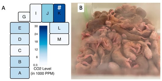 Measured CO2 levels of a naked mole-rat cage system as employed by Zions et al. [49] are shown in (A). # = location of the nest. The high density of respiring individuals can be seen in a typical nest environment, as seen in a colony housed at the University of Illinois Chicago (B), photo by Thomas Park.