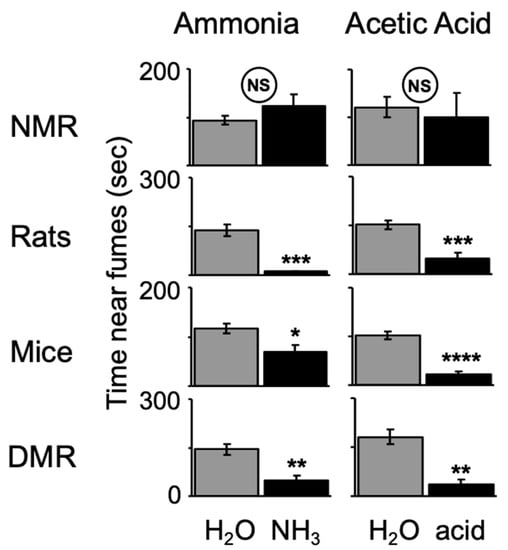 Naked mole-rats (NMR) do not avoid regions containing sponges saturated with noxious irritants creating ammonia or acetic acid fumes, whereas laboratory rats, mice, and Damaraland mole-rats (DMR) significantly avoid these irritants. * p< 0.05, ** p < 0.01, *** p < 0.001, **** p < 0.0001. This graph is from [51].