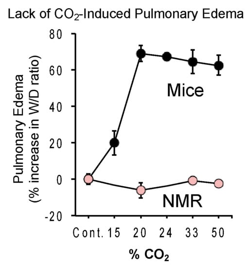Breathing high concentrations of CO2 also induces rapid and life-threatening pulmonary edema. CO2 induces changes in the alveolar permeability and reabsorption properties of the lung, and pulmonary edema happens when CO2 acidifies the tissues of the lungs, activating acid-sensitive sensory nerves in the tissues that trigger neurogenic inflammation and edema. Park et al. measured pulmonary edema from CO2 in naked mole-rats and mice [19]. Naked mole-rats showed no edema even at the highest concentration of CO2 tested (50%) (Figure 11). In contrast, mice showed significant edema at 15% and robust edema at 20–50% CO2 concentrations.