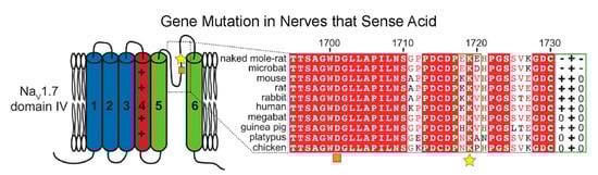 - Eigenbrod, O.; Debus, K.Y.; Reznick, J.; Bennett, N.C.; Omerbašić, D.; Sánchez-Carranza, O.; Hart, D.W.; Barker, A.J.; Lutermann, H.; Lewin, G.R.; et al. Rapid molecular evolution of pain insensitivity in multiple African rodents. Science 2019, 364, 852–859. [Google Scholar] [CrossRef]