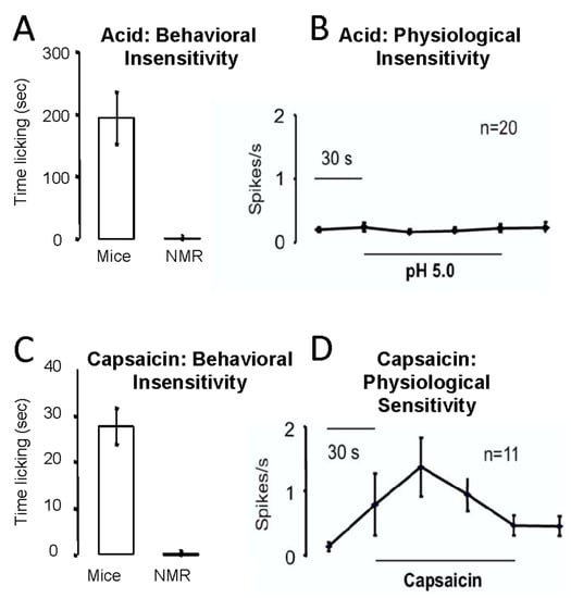 Naked mole-rats are behaviorally (A) and physiologically (B) insensitive to acid pain. They are behaviorally insensitive to capsaicin pain (C), although they showed a physiological response to capsaicin (D). The behavioral tests involved injecting an acidic saline or capsaicin solution into the skin of one hind paw. The physiological data were collected from pain-sensing C fibers from the saphenous nerve, using the in vitro skin nerve preparation as described in [52]. These data are from [22].