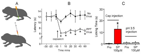 Rescue of capsaicin pain in naked mole-rats from the introduction of exogenous Substance P. (A) Application of a transgenic herpes virus expressing the preprotachykinin (PPT/TAC1) gene for Substance P (top) and intrathecal injection of Substance P (bottom). (B) This graph is associated with the animals treated with the virus. The graph shows foot withdrawal latency to heat before and after the topical application of capsaicin. The virus-treated foot (PPT Virus) shows sensitization from capsaicin, whereas the “No Virus” foot does not. (C) This graph shows the amount of time spent licking the injection site for capsaicin or acid injection before and after an intrathecal application of Substance P. * p < 0.05. These data are from [22].