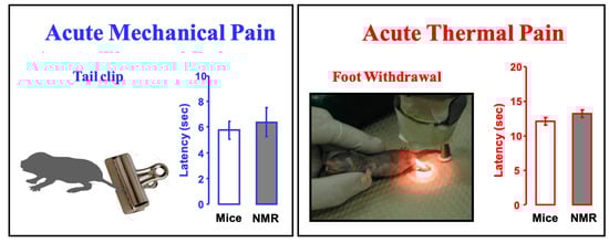 It is noteworthy that naked mole-rats respond to acute mechanical pain (pinch) and acute thermal pain (heat) in the same way as mice (Figure 15). Both naked mole-rats and mice react to a pinch with a tail clip in about 6 s (Figure 15, left), and both naked mole-rats and mice react to heat pain in about 12 s (Figure 15, right).