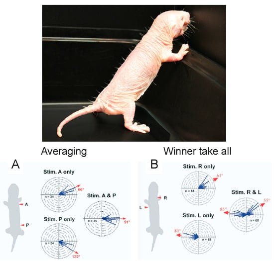 In addition to pain insensitivities, the somatosensory system of the naked mole-rat has another interesting feature. Although naked mole-rats lack fur, their bodies have 10 rows of sensitive vibrissae that form a sensory array [55]. One row of vibrissae can be seen in the photograph in Figure 17. Crish et al. [55] found that deflecting a single vibrissa triggered an accurate and repeatable orientation of the snout to the position of the deflected vibrissa. Interestingly, simultaneously deflecting two vibrissae on the same side of the body triggered an orientation response to a position that is the average of the two stimulated vibrissae. For example, stimulating a vibrissa at the shoulder and hip triggered an orientation of the snout to a position halfway between the shoulder and the hip (Figure 17A). This result indicates that the naked mole-rat nervous system is capable of making a computation about touch location. However, this is not the case for simultaneously deflecting two vibrissae on opposite sides of the body, which triggers an orientation to either one or the other deflected vibrissa in a winner-take-all strategy (Figure 17B).