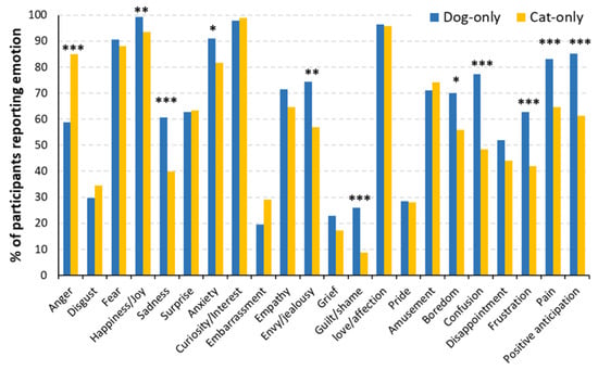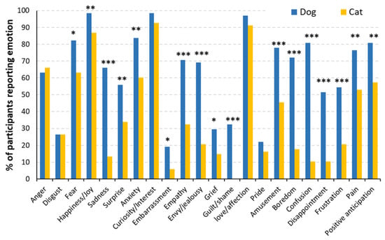 Percentage of participants reporting individual emotions as a function of species in dog-only (n = 277) and cat-only (n = 93) homes. * p < 0.05, ** p < 0.01, *** p < 0.001.