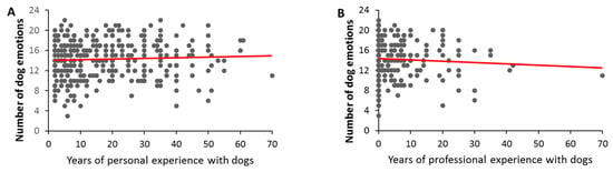 The number of emotions reported in dogs by owners with varying levels of personal (A) and professional experience with dogs (B). Trendlines show the direction of significance.