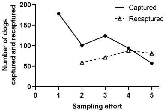 Temporal evolution in the number of free-roaming dogs captured/recaptured during the five sampling efforts carried out in an urban area located in Divinópolis, Minas Gerais, Brazil.