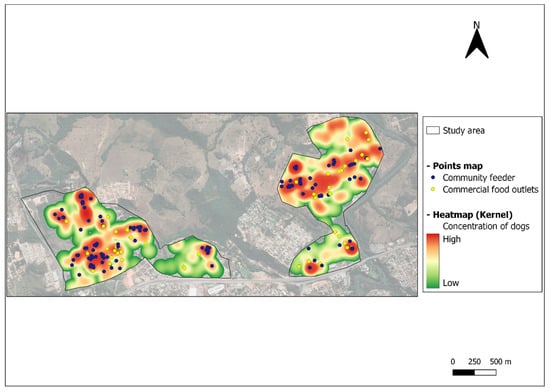 Agglomerations of free-roaming dogs were positively associated with the locations of commercial food outlets and, more especially, with those of community feeders. The provision of food by community feeders was essential in maintaining the concentration of dogs in the vicinity of food sources. The results obtained not only add to our understanding of the ecology and behavior of free-roaming dogs in urban areas but also highlight the need for policies to reduce the risks associated with the presence of free-roaming animals. Moreover, appropriate management of food and water resources should be implemented in order to improve the quality of life of these animals such as the allocation of specific and supervised points far from busy roads and residential/commercial areas. We hope that the outlined recommendations can help improve future interventions by providing more appropriate strategies. Additionally, we suggest that the spatial distribution of free-roaming dogs be more widely studied in the literature, especially through intervention studies, assessments in urban and rural areas, and evaluations of residents’ perceptions of supporting these animals.