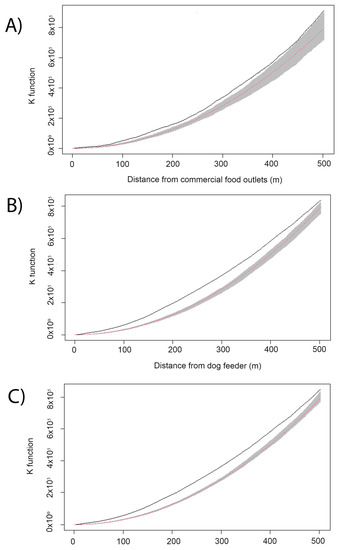 The positive spatial autocorrelations between the distribution of free-roaming dogs and (A) commercial food outlets, (B) community feeders and (C) community feeders + commercial food outlets, showing the theoretical Poisson K-function (dashed red line), the envelope of confidence (gray band) and the observed K function (solid black line).