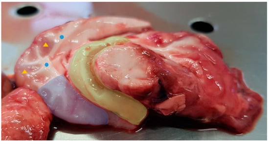 Lamb right brain hemisphere. The four collected parts are highlighted in the figure: prefrontal cortex and hippocampus are filled in blue and yellow, respectively; grey matter is identified with the yellow triangles and white matter with the blue circles.