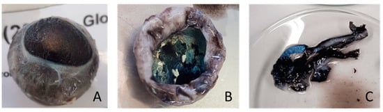 Dissection of the right eyeball of one lamb. From left to right: (A) right eyeball; (B) removal of eye structures (cornea, iris and lens) and tapetum lucidum evidenced; and (C) cutting of material used for FA analysis including tapetum lucidum and retina tissues.