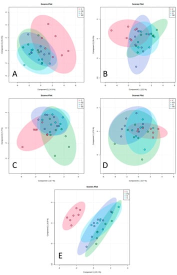 sPLSDA analysis including the FA + DMA profile. The different plots correspond to the different brain parts (A–D) and RTL tissues (E). (A) prefrontal cortex, (B) hippocampus, (C) grey matter, (D) white matter, and (E): RTL tissues. Diets are represented in different colours: red—C, control diet with no EPA sources; purple—O, diet with Nannochloropsis sp. oil; blue—SD, diet with spray-dried Nannochloropsis oceanica biomass; and green—FD, diet with freeze-dried Nannochloropsis oceanica biomass.