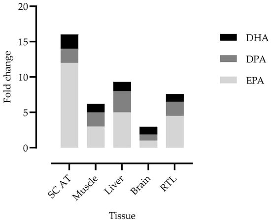The EPA fold change was higher in the SC AT and similar between the liver and RTL.