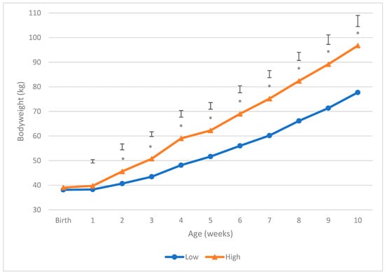 Body weight (kg) of calves offered 4 L (Low) vs. 8 L (High) of milk daily. Asterisks * indicate significant difference (p-value < 0.05). The least significant difference (LSD) is given with vertical bars at each week.