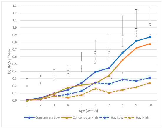 Average daily concentrate (kg DMI/calf/day) and hay (kg DM/calf/day) consumption of calves offered 4 L (Low) vs. 8 L (High) of milk daily. Asterisks * indicate significant difference (p-value < 0.05). The least significant difference (LSD) is given with vertical bars at each week (concentrate LSD lines appear above hay).