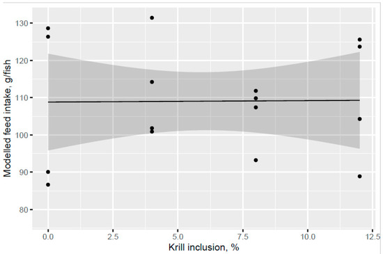 Modelled feed intake in relation to increasing KM inclusion after 53 d of feeding in the freshwater pre-transfer phase. Dots denote observed tank mean feed intake with error bars giving 95% credible intervals.