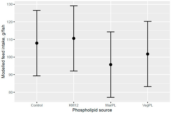 Modelled feed intake for diets containing different phospholipid sources after 53 d of feeding in the freshwater pre-transfer phase. Dots denote observed tank mean feed intake with error bars giving 95% credible intervals.