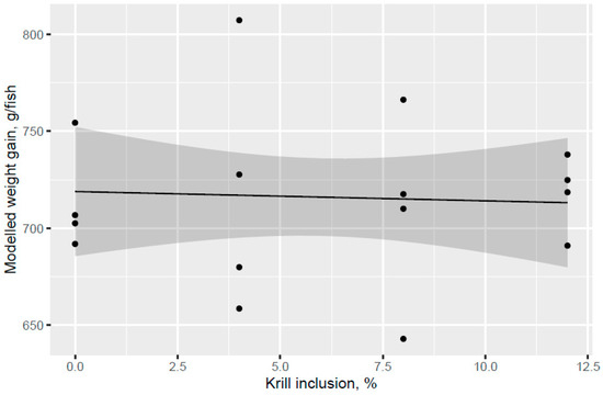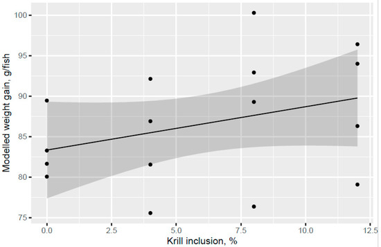 Modelled weight gain with increasing KM inclusion after 53 d of feeding in the freshwater pre-transfer phase plotted with 95% credible intervals as the grey band. Dots denote observed tank mean weight gain.