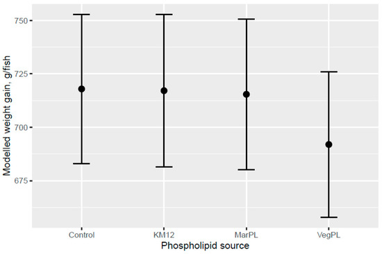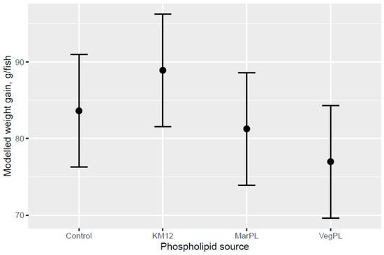 Modelled weight gain after feeding diets with different phospholipid sources for the whole trial, with 53 d in the freshwater pre-transfer phase on test diets followed by feeding the same commercial diet over 98 d in the common seawater tank. The bars are plotted with 95% credible intervals. Dots denote observed tank mean weight gains.