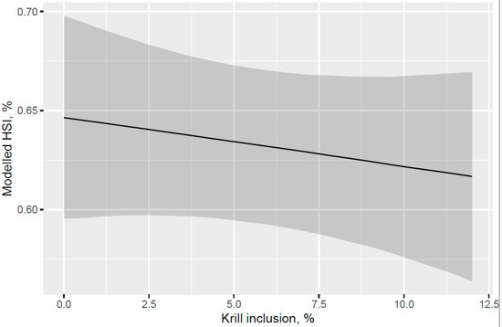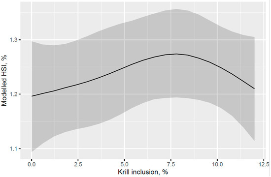 Modelled hepatosomatic index (HSI) with increasing KM inclusion after 53 d of feeding in the freshwater pre-transfer phase plotted with 95% credible intervals as the grey band. HSI is derived from the model for a 160 g average-sized sampled fish.