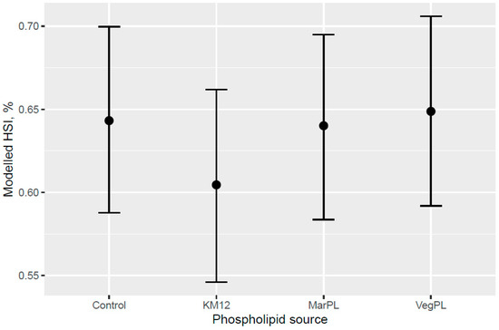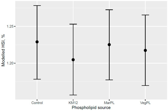 Modelled hepatosomatic index (HSI) for different phospholipid sources after 53 d of feeding in the freshwater pre-transfer phase plotted with 95% credible intervals. HSI is derived from the model for a 157 g average-sized sampled fish.