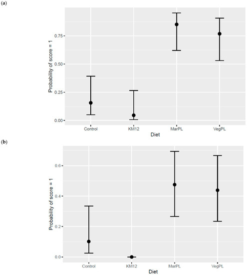 An increased probability for very mild to mild gill lamella inflammation and hyperplasia score was indicated for the salmon that were fed the VegPL and MarPL diets compared to the Control and 12% KM diets at the end of the freshwater pre-transfer phase after 53 d of feeding the trial diets (Figure 11a,b). Other following gill histology responses were evaluated with no major differences between the diets: vascular lesions, filament inflammation, necrosis of respiratory epithelium, necrosis affecting deeper tissues, fusion of lamella ,and other lesions noted as present or absent.