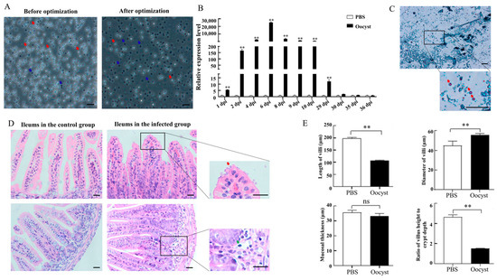 Optimization of the excystation scheme could significantly increase the excystation rate from 40% to over 85%, as shown in Figure 1A (p < 0.05). Compared with the control group, the relative mRNA expression levels of Cryptosporidium 18S rRNA gene in the mouse ilea in C. parvum-infected group increased gradually and reached a peak at 6 dpi, then gradually decreased. The duration period of C. parvum infection in the mouse model reached 29 days (Figure 1B). Acid-fast stain analysis of the large intestine contents at 6 dpi recognized rosy oocysts in the infected group (Figure 1C). Histopathology analyses of mouse ileum tissues at 6 dpi found the existence of C. parvum and the infiltration of the inflammatory cells in the ileum tissues of the infected group (Figure 1D); subsequently statistical analysis indicated C. parvum infection significantly deceased the length of villi and the ratio of villus height to crypt depth, and significantly increased the diameter of villi (Figure 1E).