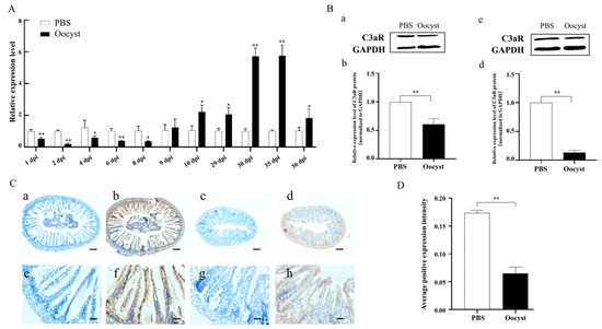 Expression of C3aR in the ilea of mice infected with C. parvum. (A) Analysis of relative expression levels of C3aR in ileum tissues of mice infected with C. parvum; (B) C3aR protein expression levels in ileum tissues of mice. a and c: Western blotting analysis at 2 and 6 dpi; b and d: statistical analysis at 2 and 6 dpi; (C) Immunohistochemical staining results of C3aR protein in ileum tissues (6 dpi) of mice. a and e: no primary antibody (control group); b and f: with primary antibody (control group); c and g: no primary antibody (infected group); d and h: with primary antibody (infected group); (D) Statistic analysis of immunohistochemical staining results of C3aR protein. * means p < 0.05, ** means p < 0.01.