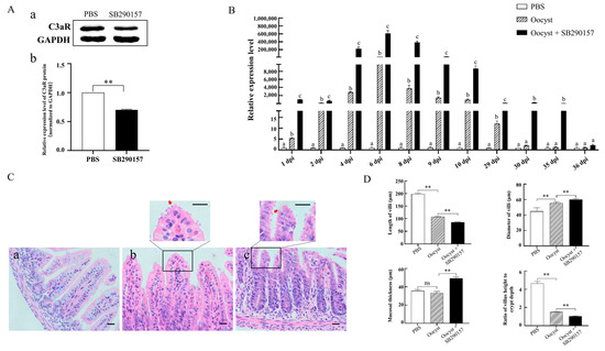 As shown in Figure 3A, the protein level of C3aR in mouse ileum tissues was significantly down-regulated three hours after intraperitoneal injection with SB290157 (Figure 3A and Figure S3). Further studies indicated that inhibition of mouse C3aR significantly up-regulated the relative mRNA expression levels of the Cryptosporidium 18S rRNA gene in mouse ileum tissues during C. parvum infection (p < 0.05). Meanwhile, the infection duration period increased from 29 days to 35 days in the C3aR-inhibited infected group (Figure 3B). Significant differences were found between the relative transcriptional expression of Cryptosporidium 18S rRNA among the three groups (PSB, Oocyst, and Oocyst + SB290157) at 1 dpi (F = 359.612, p < 0.001), 2 dpi (F = 58.443, p < 0.001), 4 dpi (F = 44.112, p < 0.001), 6 dpi (F = 215.622, p < 0.001), 8 dpi (F = 393.826, p < 0.001), 9 dpi (F = 114.706, p < 0.001), 10 dpi (F = 427.847, p < 0.001), 29 dpi (F = 41.950, p < 0.001), 30 dpi (F = 55.628, p < 0.001), 35 dpi (F = 25.905, p < 0.001) and 36 dpi (F = 13.106, p = 0.006). Histopathology analyses of mouse ileum tissues at 6 dpi found the existence of C. parvum in the ileum tissues in the infected group and the C3aR-inhibited group (Figure 3C). Subsequent statistical analysis indicated that C. parvum infection in C3aR-inhibited group further decreased the length of villi and the ratio of villus height to crypt depth, and increased the diameter of villi and mucosal thickness compared with the normal mouse in the infected group (Figure 3D), suggesting that C3aR likely alleviated the intestinal injury caused by C. parvum.