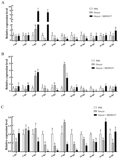 Significant differences were found between the relative transcriptional expression levels of the ifn-γ gene among the three groups (PSB, Oocyst, and Oocyst + SB290157) at 1 dpi (F = 69.841, p < 0.001), 2 dpi (F = 300.925, p < 0.001), 4 dpi (F = 58.746, p < 0.001), 6 dpi (F = 72.761, p < 0.001), 8 dpi (F = 97.252, p < 0.001), 9 dpi (F = 38.113, p < 0.001), 10 dpi (F = 12.446, p = 0.007), 29 dpi (F = 48.334, p < 0.001), 30 dpi (F = 19.592, p = 0.002), 35 dpi (F = 41.574, p < 0.001) and 36 dpi (F = 45.236, p < 0.001). Compared with the control group, the mRNA expression levels of the ifn-γ gene of mouse ileum tissues in C. parvum-infected group were significantly down-regulated at 1 dpi, but up-regulated at most time points. Inhibition of C3aR led to the significant up-regulation of ifn-γ at 1 dpi, 2 dpi, 8 dpi, 9 dpi and 29 dpi, but down-regulation at 6 dpi, 30 dpi and 35 dpi (Figure 6A).