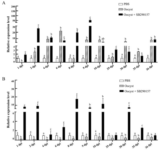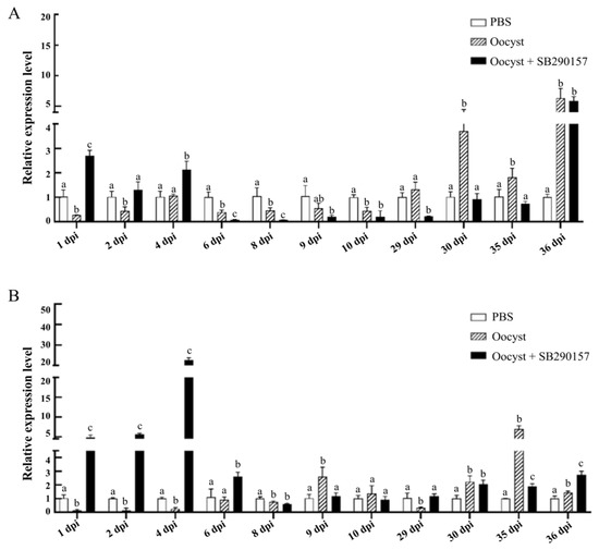 Significant differences were found between the relative transcriptional expression levels of the tgf-β gene among three groups (PSB, Oocyst, and Oocyst + SB290157) at 1 dpi (F = 1721.105, p < 0.001), 2 dpi (F = 35.969, p < 0.001), 6 dpi (F = 30.388, p = 0.001), 8 dpi (F = 51.836, p < 0.001), 9 dpi (F = 94.612, p < 0.001), 10 dpi (F = 8.058, p = 0.020), 29 dpi (F = 87.382, p < 0.001), 30 dpi (F = 19.085, p = 0.003), 35 dpi (F = 205.922, p < 0.001) and 36 dpi (F = 8.847, p = 0.016), while the difference at 4 dpi (F = 4.687, p = 0.059) was not significant. Cryptosporidium parvum infection significantly down-regulated the mRNA expression level of the tgf-β at most time points. Inhibition of C3aR led to the significant up-regulation of tgf-β at all time points post infection (Figure 6B).