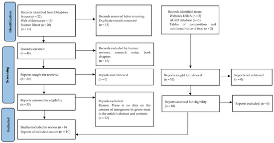 The screening was made in the areas: title, abstract, keywords (Scopus), and topic (Web of Science, Science Direct). The search and selection process was performed by two reviewers working independently and in parallel. The results from each database were exported to files with the appropriate extension of CSV or excel, and summaries were created for each database containing publication information, including abstracts. The files are included in Supplementary Materials. Initial searches returned 61 results, and 46 peer-reviewed papers were selected for consideration based on relevance after removing duplicates. Two independent researchers reviewed the title, abstracts, and papers that did not meet the criteria for inclusion in the review were excluded through discussion. Two independently working researchers analyzed the results obtained to avoid errors. Any inconsistencies were resolved through discussion. Exclusion criteria were as follows: reviews, research notes, book chapters, and no data on the content of manganese in goose meat in the article’s abstract and contents. Additional searches were performed on the FoodData Central U.S. website Department of Agriculture (USDA) [25]. A total of 11 original studies, 5 reports from the USDA database, and 2 reports from Tables of composition and nutritional value of food [26] were selected for review (Table 1). Figure 1 presents a diagram of the literature search and selection criteria.