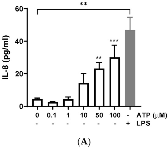 Bovine endometrial cells were treated with different concentrations of ATP for 24 h, and IL-8 release was determined in the supernatant. ATP (50 and 100 μM) significantly increased the production of IL-8 compared with the control (vehicle) (Figure 1A) (50 μM: 23.16 ± 3.82 pg/mL, p = 0.0018; 100 μM: 30.14 ± 7.43 pg/mL, p = 0.0004); similarly, the positive control LPS induced IL-8 release (p < 0.01), as has been described in several studies [35,36,37]. The treatment of BEND cells with ATP plus LPS showed an additive effect on IL-8 release (Figure 1B), for each concentration of ATP assessed.