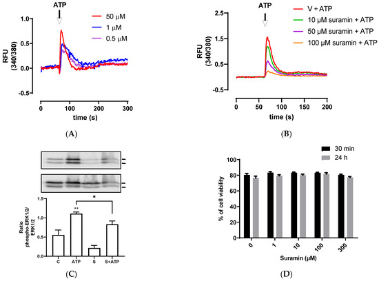 ATP increases intracellular calcium mobilization and ERK1/2 phosphorylation. (A) Fura 2AM-loaded BEND cells were treated with vehicle (PBS) and basal fluorescence was registered for 60 s; then, different concentrations of ATP (0.1, 1, or 50 μM) were added and the fluorescence was determined for 240 s. RFU = relative fluorescence units. (B) Fura 2AM-loaded BEND cells were incubated with vehicle (0.1% DMSO) or suramin (10, 50, or 100 μM) for 15 min. Then, the basal fluorescence was registered for 60 s and ATP (50 μM) was added, and the fluorescence registered for 140 s. V = vehicle. (C) BEND cells were incubated with vehicle (0.1% DMSO) or suramin (50 μM) for 15 min, and then vehicle (PBS) or ATP (50 μM) was added, and incubation was carried out for 5 min. Total proteins were analyzed by immunoblot with antibodies against phospho-ERK1/2 and total ERK1/2. c = control (0.1% DMSO). S = Suramin. Bands’ intensities are shown as the ratio phospho-ERK1/2/ERK1/2 in the bar graph. (D) BEND cells were incubated with vehicle (0.1% DMSO) or suramin (1, 10, 100, or 300 μM) for 30 min or 24 h, and the cellular viability was measured by propidium iodide assay. * p < 0.05, ** p < 0.01 compared with the control. Images are representative of three independents experiments.