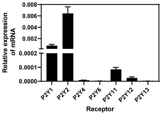 Levels of expression of mRNA P2Y subtype receptors in BEND cells. Total RNA was isolated from BEND cells and RT-qPCR for P2Y subtype receptors was performed. Level of expression of each subtype receptor was determined by the 2−ΔΔCt method. n = 3 independent experiments.