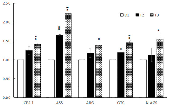 The relative expression levels of CPS-1, ASS, ARG, OTC, and N-AGS mRNA in liver. Control group (D1), low protein with low RPAA (T2), and low protein with high RPAA (T3). CPS-1 = Carbamoyl-phosphate synthase 1; ASS = Argininosuccinate synthase; ARG = Arginase; OTC = Ornithine carbamoyltransferase; N-AGS = N-acetylglutamate synthase. *: The difference is significant. **: The difference is extremely significant.