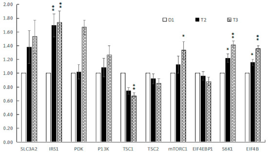 The relative expression levels of SLC3A2, IRS1, PDK, P13K, mTORC1, eIF4EBP1, S6K1, and eIF4B mRNA in liver. Control group (D1), low protein with low RPAA (T2), low protein with high RPAA (T3). SLC3A2 = Solute carrier family 3 (amino acid transporter heavy chain), member 2; IRS1 = Insulin receptor substrate 1; PDK = Phosphoinositide-dependent protein kinase; P13K = Phosphoinositol 3-kinase; TSC1 = Tuberous sclerosis complex 1; TSC2 = Tuberous sclerosis complex 2; mTORC1 = Mammalian target of rapamycin complex 1; S6K1 = Ribosomal protein S6 kinases; eIF-4B = Eukaryotic initiation factor. *: The difference is significant. **: The difference is extremely significant.