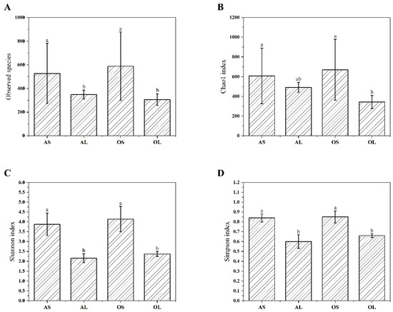 Effects of bamboo part consumption and age on alpha diversity indices of fecal microbiome in captive giant pandas. (A) Observed species. (B) Chao1 index. (C) Shannon index. (D) Simpson index. AS (n = 11), adult giant pandas fed with bamboo shoots; AL (n = 11), adult giant pandas fed with bamboo leaves; OS (n = 11), old giant pandas fed with bamboo shoots; OL (n = 11), old giant pandas fed with bamboo leaves. In each panel, values are presented as mean ± standard error; bars with different letters denote a significant difference (p < 0.05).