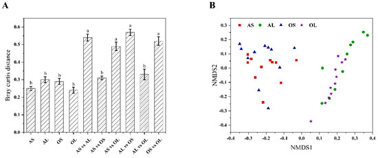 The beta diversity index and structure analysis of fecal microbiome in giant pandas. (A) The intra- and inter-group Bray–Curtis distance. (B) Non-metric multidimensional scaling (NMDS) ordination plot derived from the Bray–Curtis distances in feces of giant pandas. AS (n = 11), adult giant pandas fed with bamboo shoots; AL (n = 11), adult giant pandas fed with bamboo leaves; OS (n = 11), old giant pandas fed with bamboo shoots; OL (n = 11), old giant pandas fed with bamboo leaves. In panel (A), values are presented as mean ± standard error; bars with different letters denote a significant difference (p < 0.05).