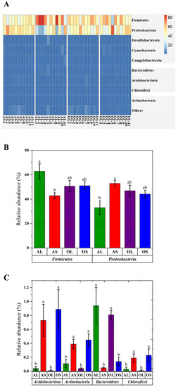 Effects of bamboo part consumption and age on the taxa distribution at the phylum level in giant pandas. (A) Heat map of relative abundance of phyla. (B,C) Significantly different phyla in feces among four groups. AS (n = 11), adult giant pandas fed with bamboo shoots; AL (n = 11), adult giant pandas fed with bamboo leaves; OS (n = 11), old giant pandas fed with bamboo shoots; OL (n = 11), old giant pandas fed with bamboo leaves. In panel (B,C), values are presented as mean ± standard error; bars with different letters mean significant difference (p < 0.05).