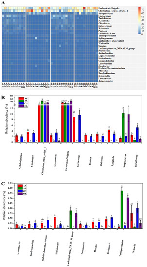 Effects of bamboo part consumption and age on the taxa distribution at the genus level in giant pandas. (A) Heat map of relative abundance of top 30 genera. (B,C) Significantly different genera in feces among four groups. AS (n = 11), adult giant pandas fed with bamboo shoots; AL (n = 11), adult giant pandas fed with bamboo leaves; OS (n = 11), old giant pandas fed with bamboo shoots; OL (n = 11), old giant pandas fed with bamboo leaves. In panel (B,C), values are presented as mean ± standard error; bars with different letters mean significant difference (p < 0.05).