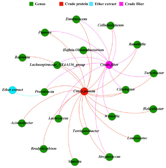 The genus Streptococcus and Lachnospiraceae_NK4A136_group were significantly positively correlated with crude fiber digestibility, whereas the genus Lactococcus, Turicibacter, Raoultella, Citrobacter, Enterococcus, Pantoea, Cellulosilyticum, Weissella, Providencia, and Hafnia-Obesumbacterium were significantly negatively correlated with crude fiber digestibility (p < 0.05, Figure 5). The genus Streptococcus, Terrisporobacter, and Lachnospiraceae_NK4A136_group were significantly negatively correlated with crude protein digestibility, whereas the genus Lactococcus, Turicibacter, Raoultella, Citrobacter, Enterococcus, Ralstonia, Pantoea, Cellulosilyticum, Weissella, Providencia, Helicobacter, Hafnia-Obesumbacterium, Massilia, Bradyrhizobium, Leuconostoc, and Acinetobacter were all significantly positively correlated with crude protein digestibility (p < 0.05, Figure 5). The genus Providencia was significantly positively correlated with ether extract digestibility (p < 0.05, Figure 5).