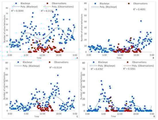 Frequency of active behaviours for red panda at three zoos, in 10 min intervals. The red lines show when direct observations were carried out. R2 values are calculated from an nth order polynomial line. (A) All zoos combined; (B) Auckland Zoo; (C) Hamilton Zoo; (D) Currumbin Wildlife Sanctuary.
